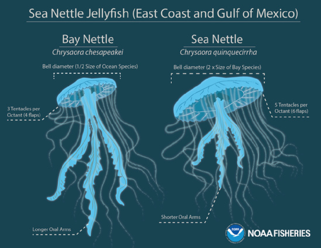 Bay nettles are stinging jellyfish found in Bays (Sea Nettles are in the Ocean). Their diet consists mainly of fish eggs, larva, zooplankton, and other small and drifting animals. Unlike other native species found in the bay, bay nettles are able to thrive in warm waters with low oxygen levels. This type of habitat hinders its prey which makes them slower and easier to catch. As bay nettle populations rise in these more compromised water bodies, populations of native species will fall.