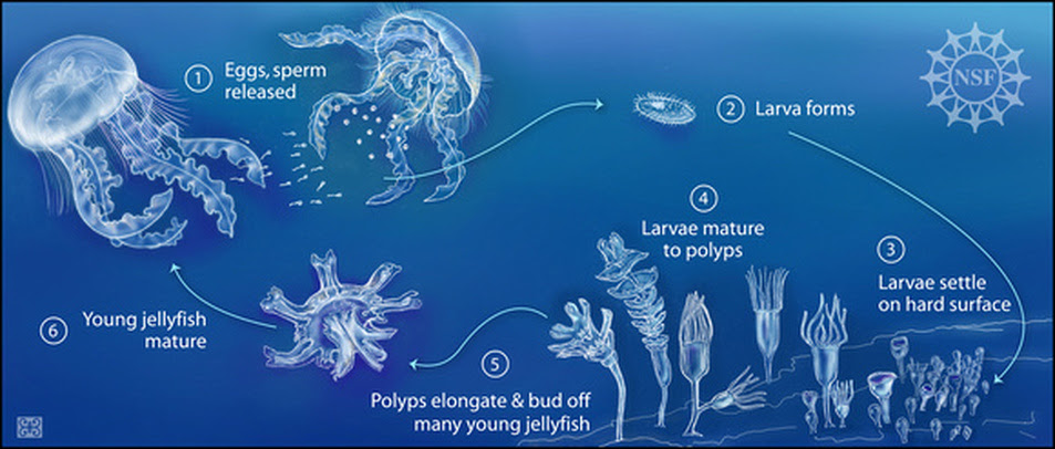 Scientists attribute the rise of jellyfish in Bays to a number of factors: pollution, warmer water and development of the bay’s shoreline. When nutrient pollution pours nitrogen into the bay, its oxygen levels decrease, which suffocates larger competition. Bay nettles and other kinds of jellyfish survive in warmer, hypoxic (low oxygen) waters. Development provides more bulkheads, pilings, and floating docks that can hold thousands of polyps. Which asexually produce millions of ephyrae, that swim free to other locations as small jellyfish, and mature into stinging adults.