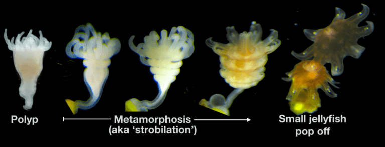 Bay nettles begin their life cycle in a polypoid stage when they are only millimeters long and have small tentacles used for feeding. During this polyp stage, the bay nettles must attach or settle onto a sturdy surface like bulkheads and floating docks. Once attached, a single polyp can reproduce asexually by “cloning” multiple new jellyfish. The medusa stage of the bay nettle’s life has six steps before it becomes an adult medusa. At every step, the medusa grows in size and number of tentacles until it takes its familiar shape, with the large top or bell and up to 16 tentacles hanging down from the bell.